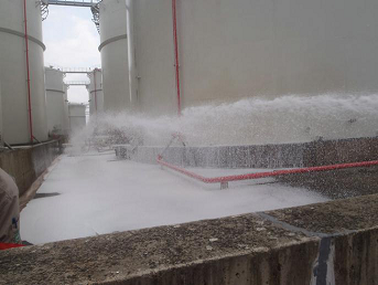 2017年6月21日,盛源石化組織開展了儲罐泄漏著火綜合應急演練,演練模擬T905儲罐轉(zhuǎn)罐過程中,罐邊進料管線金屬軟管墊片爆裂,造成大量汽油泄漏,靜電引燃著火。