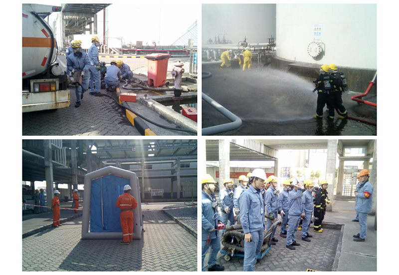 1月23日,盛源公司聯(lián)合立沙島應(yīng)急基地在罐區(qū)舉行了T610罐金屬軟管破裂“盲演”(不預(yù)先通知時間、地點,不設(shè)臺詞劇本)?,F(xiàn)場作業(yè)人員發(fā)現(xiàn)T610罐金屬軟管發(fā)生破裂泄漏后迅速報告,總指揮迅速啟動公司生產(chǎn)事故二級響應(yīng),現(xiàn)場指揮組織各應(yīng)急小組集合趕赴現(xiàn)場開展堵漏搶險工作。搶險救援組對泄漏點進行堵漏,但并未堵漏成功,隨后聯(lián)系立沙島應(yīng)急基地請求外部支援。立沙島應(yīng)急基地人員到達(dá)現(xiàn)場后,與公司各應(yīng)急小組人員緊密配合,最終堵漏成功。