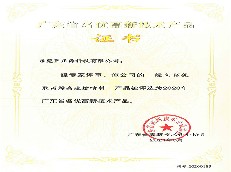 廣東省名優(yōu)高新技術(shù)產(chǎn)品證書(熔噴料)點(diǎn)擊查看大圖