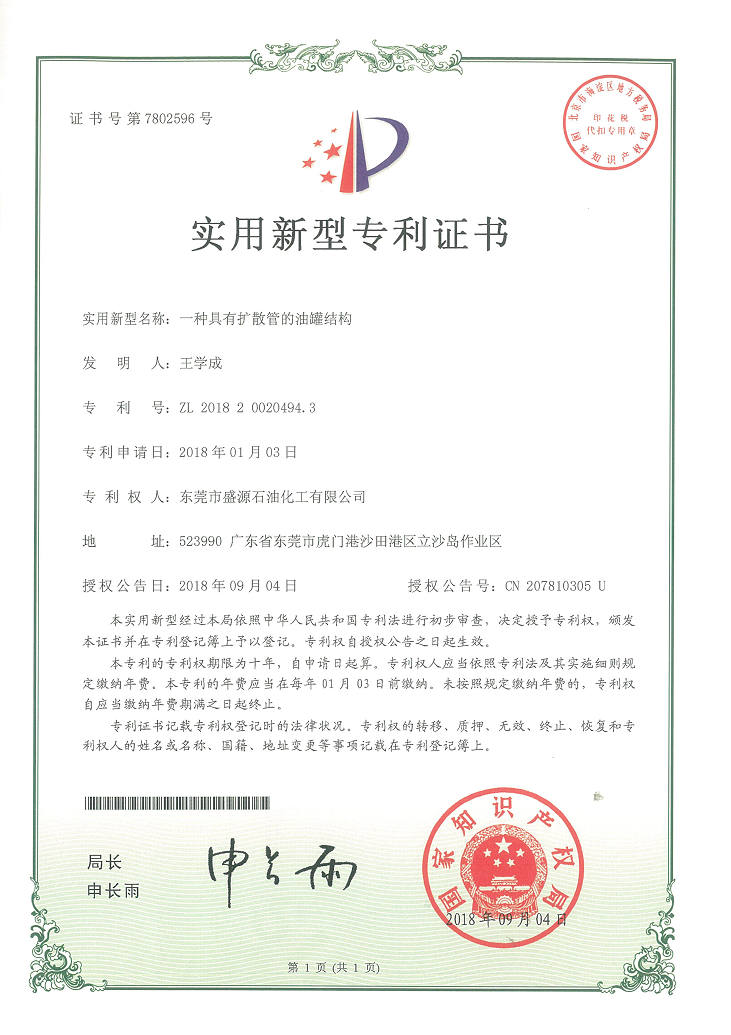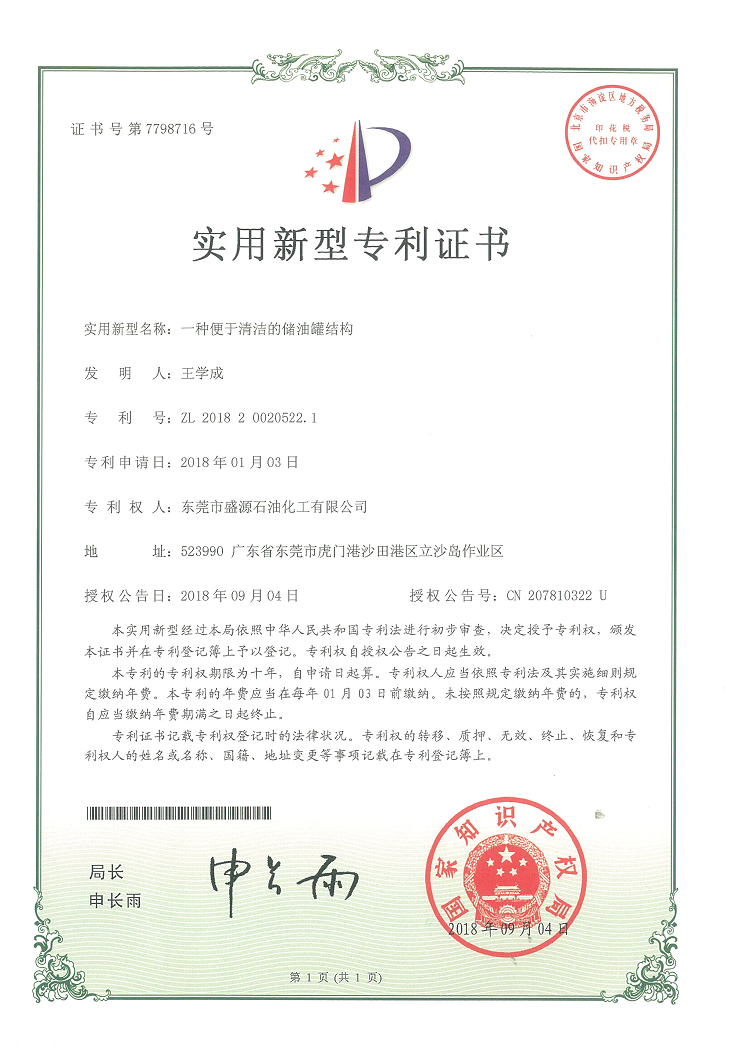 實用新型油罐結(jié)構(gòu)專利證書點擊查看大圖