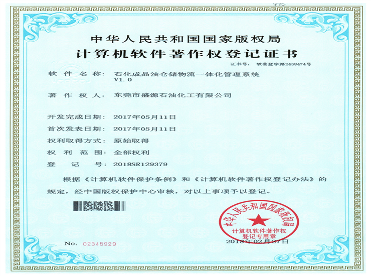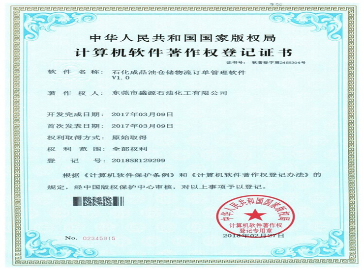 石化倉儲物流一體化管理系統(tǒng)著作權(quán)登記證書點擊查看大圖